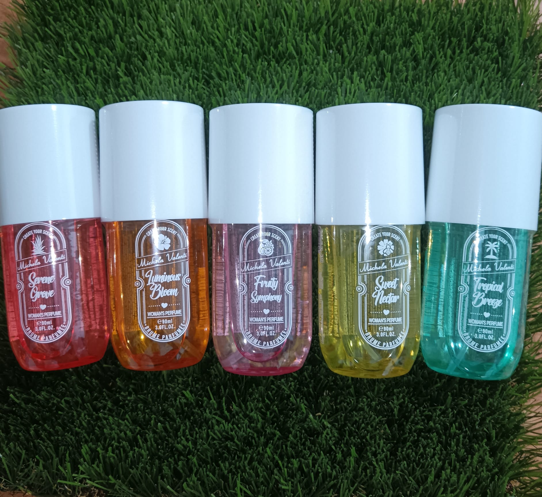 Las brumas corporales de la marca Michele Valenti que aparecen en la imagen (Serene Grove, Luminous Bloom, Fruity Symphony, Sweet Nectar y Tropical Breeze) suelen estar inspiradas en fragancias populares de perfumería internacional, pero adaptadas en versiones más ligeras y frescas.
