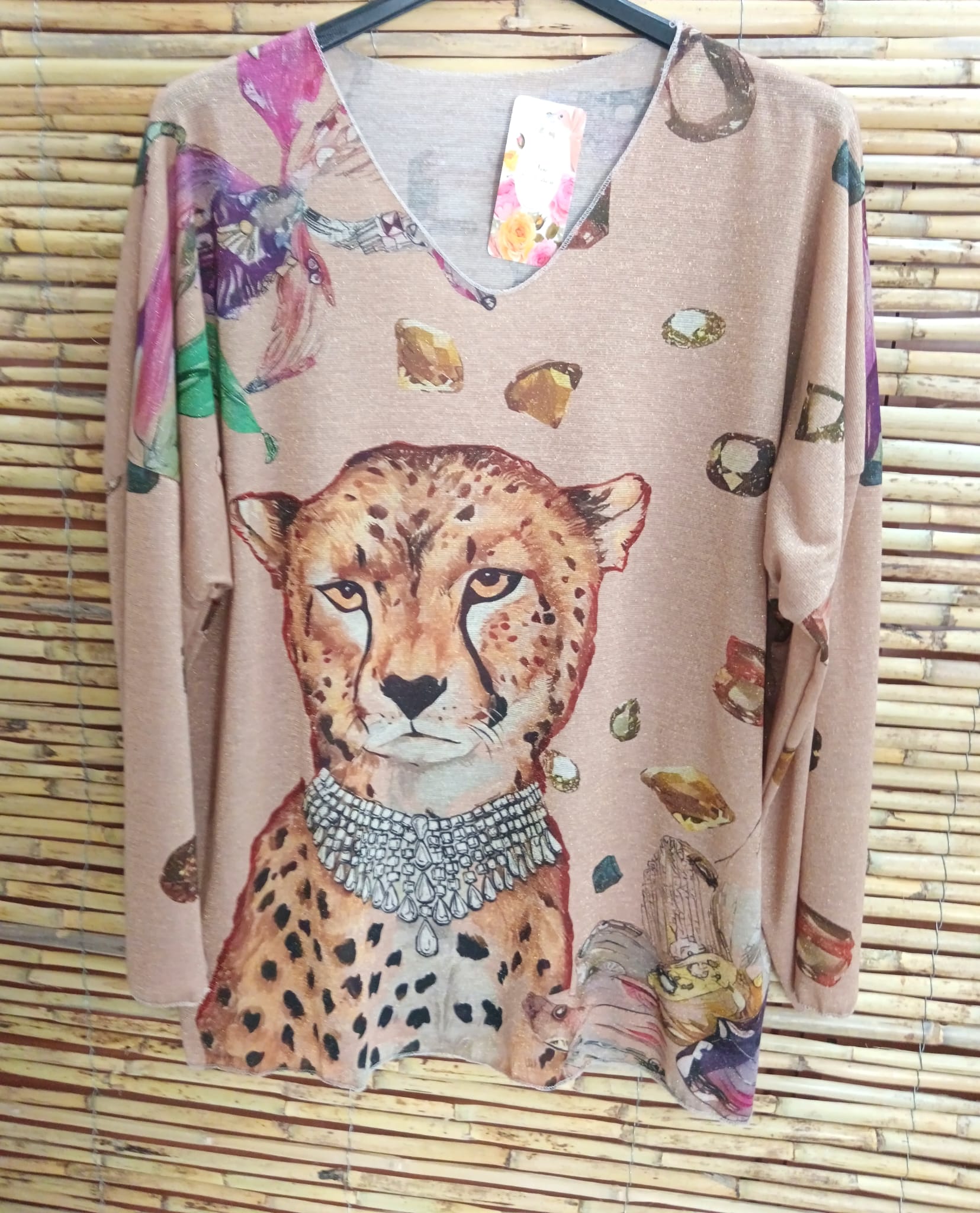 Camiseta de punto fino , con destellos dorados. manga larga y escote en pico.