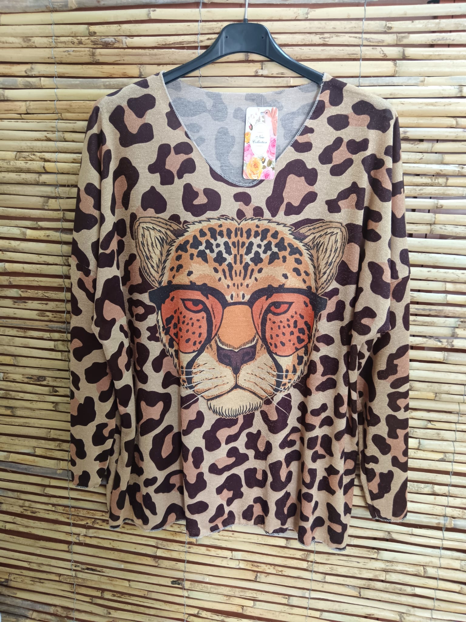 Camiseta de punto fino , con destellos dorados. manga larga y escote en pico.