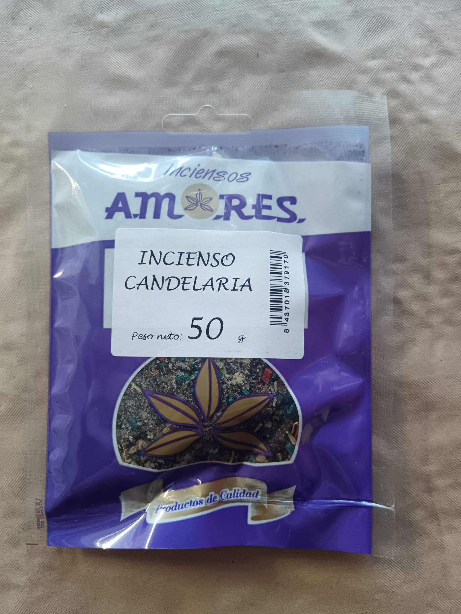 Paquete de incienso de la marca AMORES, específicamente la variedad «Candelaria«.