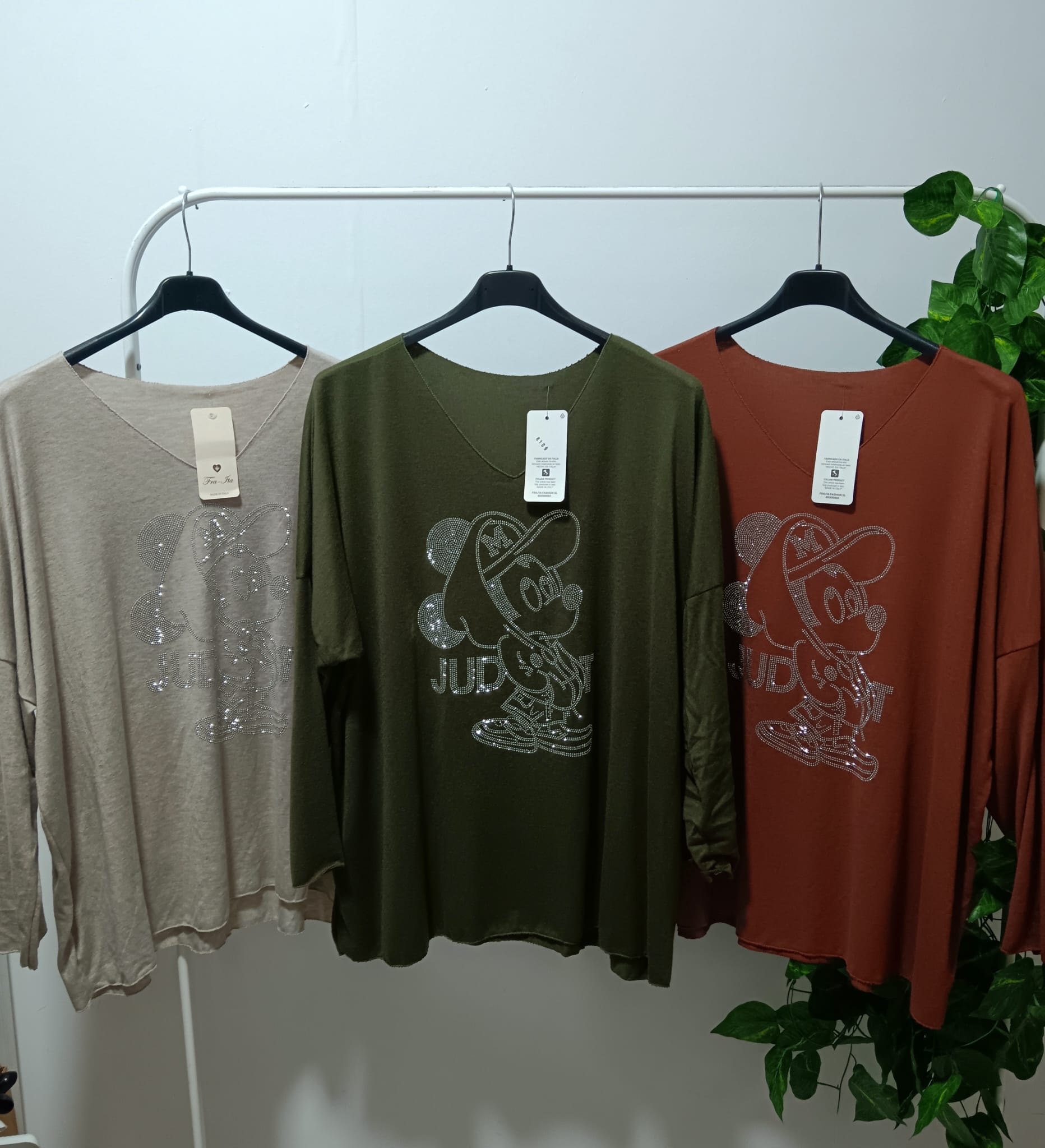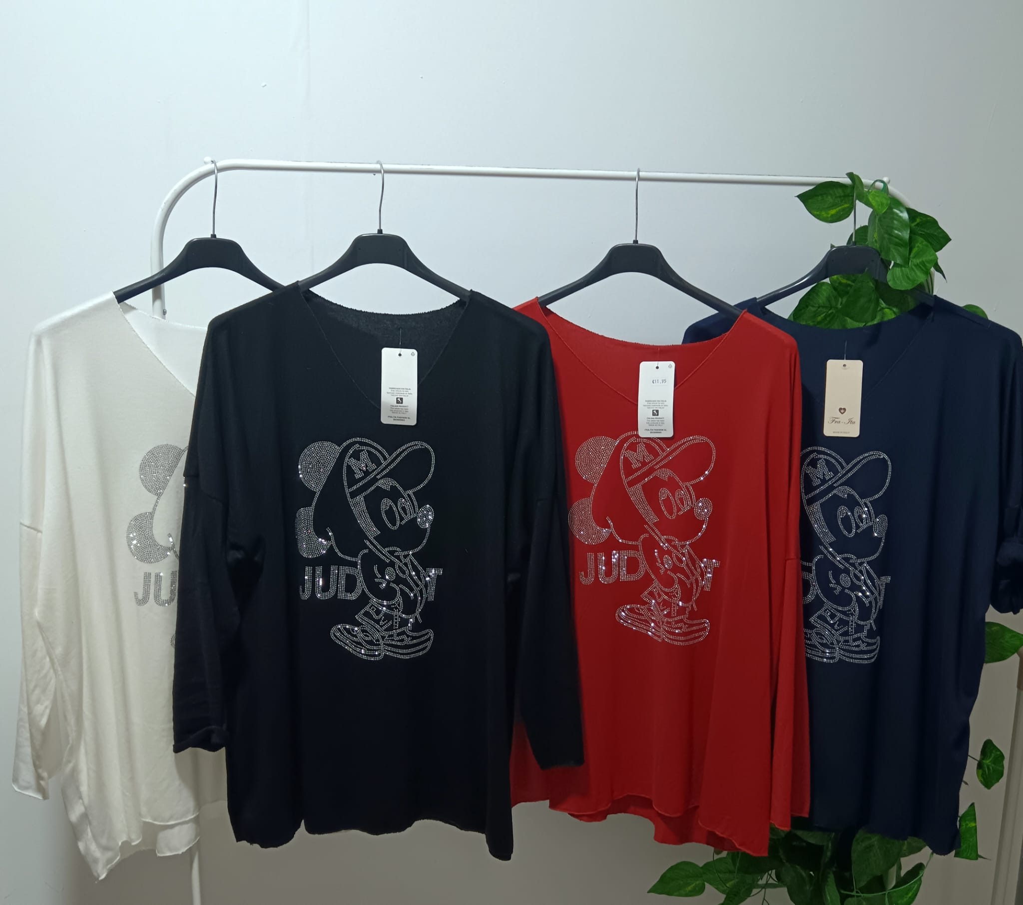 Esta camiseta tiene un diseño brillante en la parte frontal que representa a un personaje caricaturesco con gorra (similar a un ratón con estilo urbano) y la palabra «JUDY» escrita debajo del dibujo con letras también brillantes.