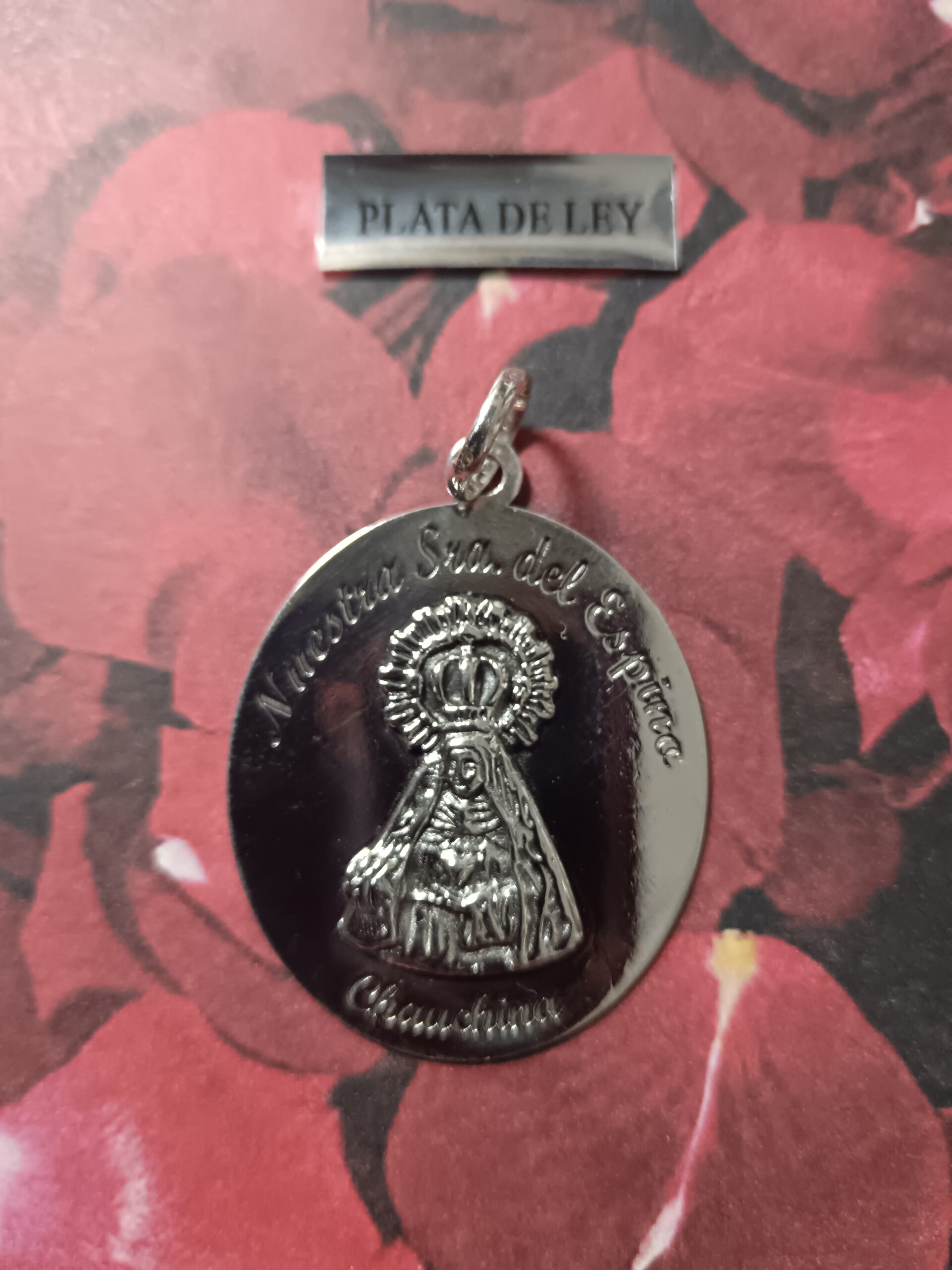 Medalla redonda de plata de Ley, con virgen de nuestra señora del Espino en relieve.