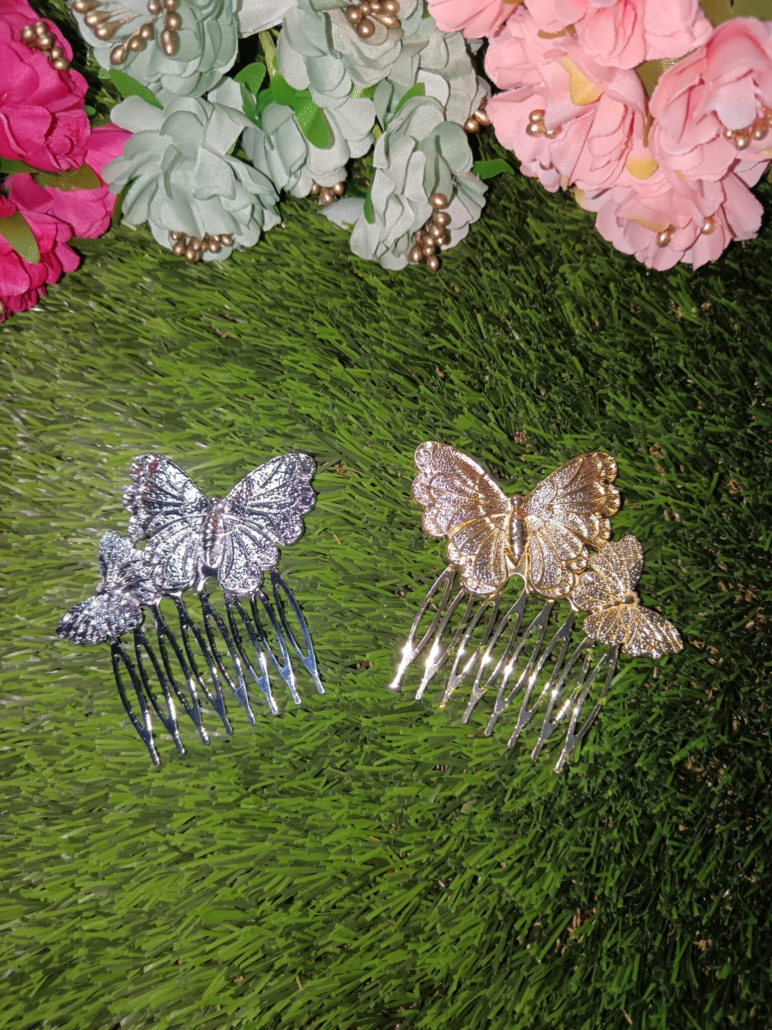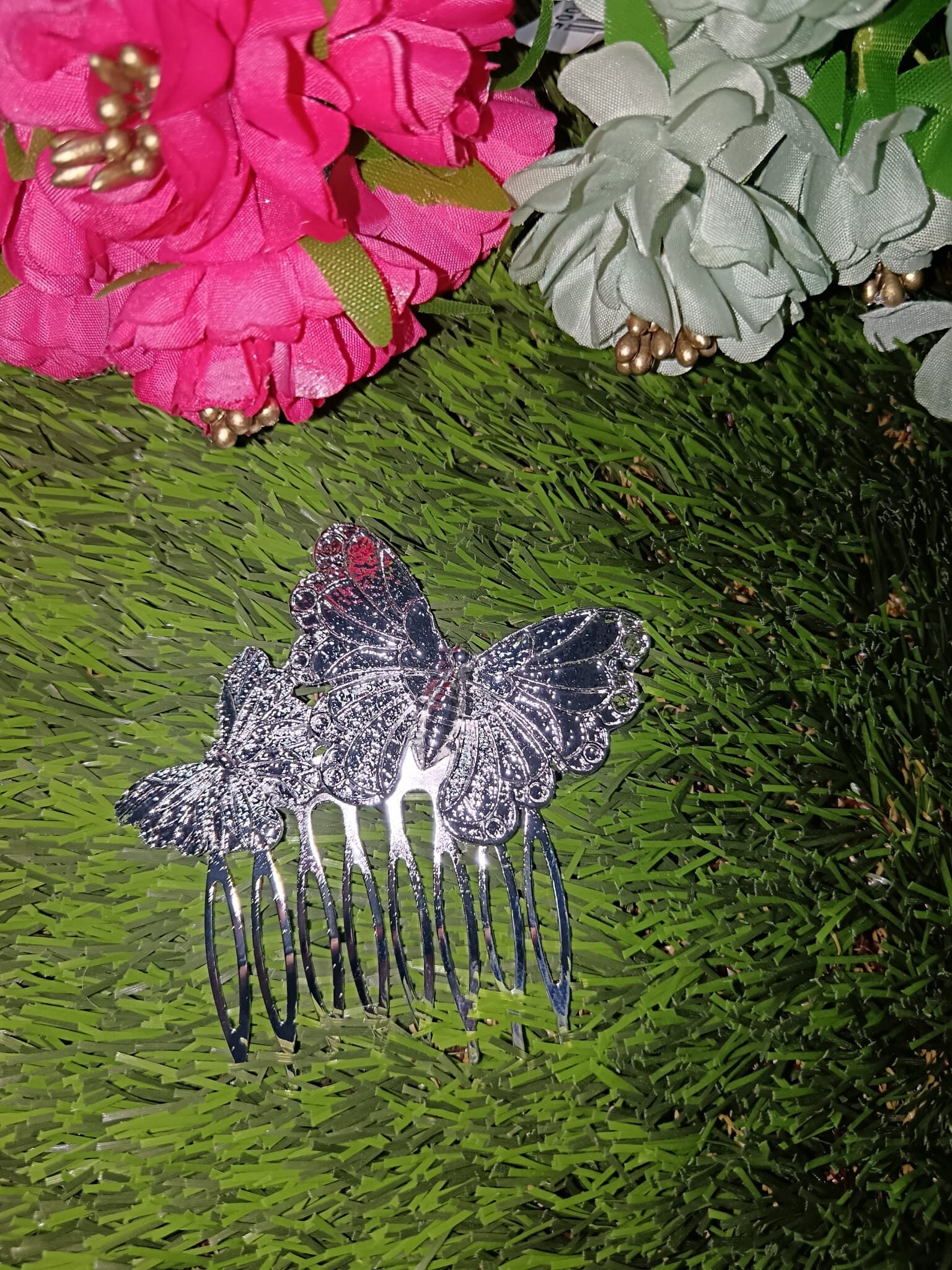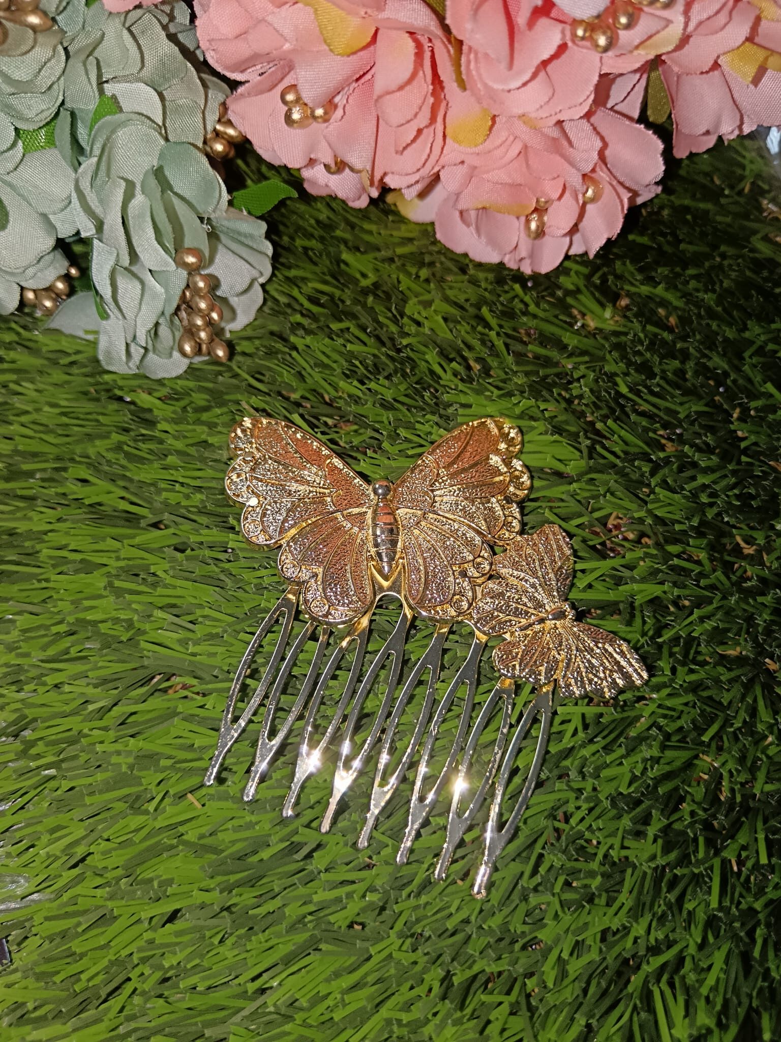 Realza tu peinado con un toque de elegancia y naturaleza. Este peinecillo metálico presenta un exclusivo diseño de doble mariposa en relieve, ideal tanto para lucir con el traje de flamenca en la feria como para dar un detalle sofisticado a recogidos de invitada en bodas y eventos.