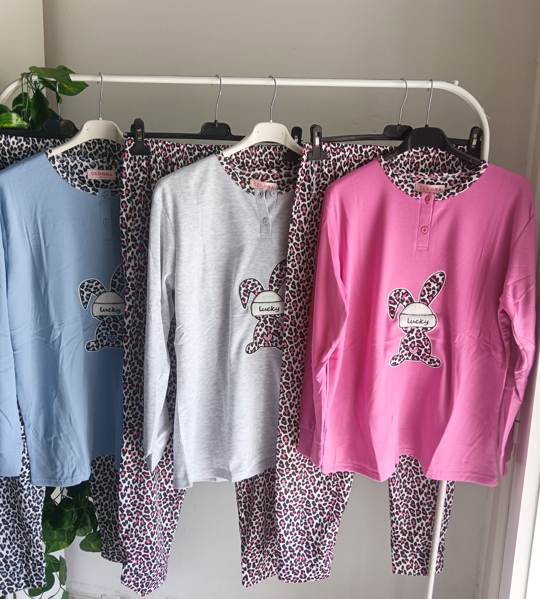 Pijama de dos piezas, con camiseta lisa con filos de animal print y dibujo de conejito. Pantalón estampado a juego con los filos de la camiseta.