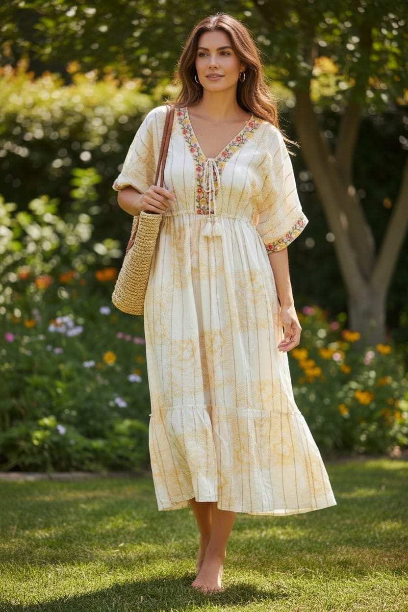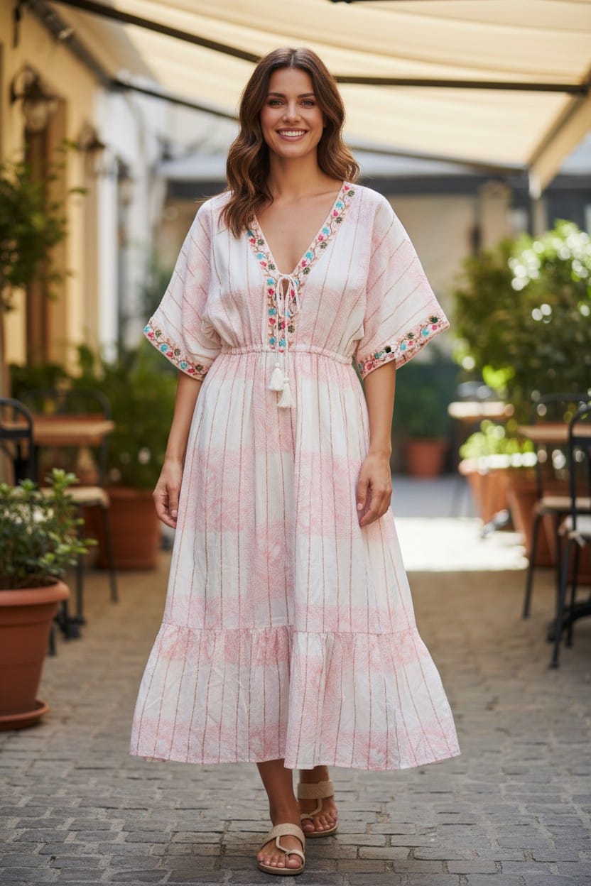 - Escote en V con Detalles: Presenta un delicado escote en pico realzado con un panel bordado y acabados con cordones ajustables y borlas artesanales.